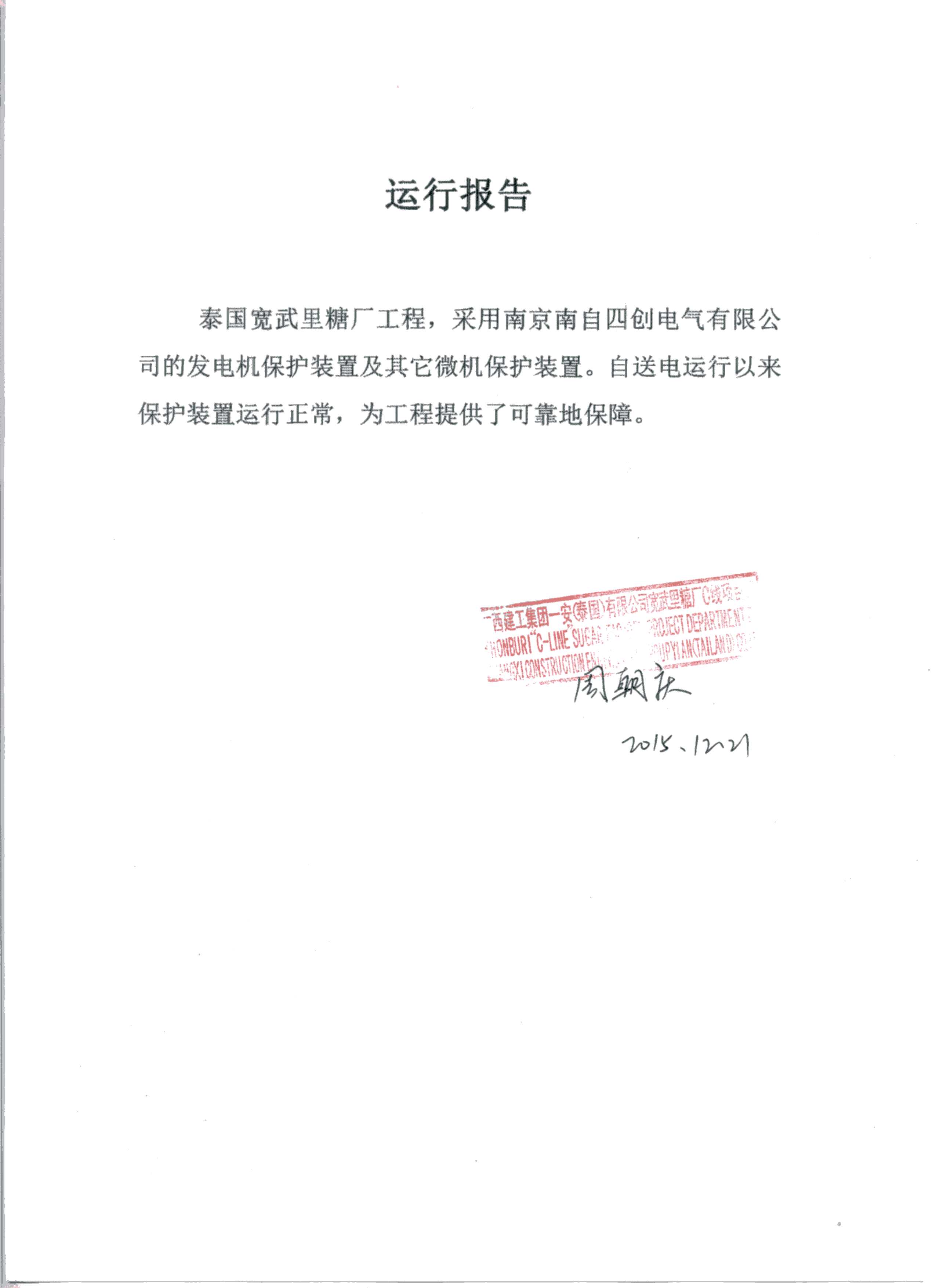 泰国宽武里糖厂项目于近日成功运行,我公司负责电气继保部分;泰国宽武里KBS“C线”糖厂日榨糖量1200tcd,工程规模为一套15兆瓦的凝汽式汽轮发电机组,6.6KV的微机综合保护装置和计算机后台监控系统。该工程电气部分于2015年3月开工建设,我公司委派高级工程师在现场进行专项攻关,较好地解决了问题。该项目于原定计划日期时期成功运行。